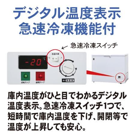 庫内温度がひと目でわかるデジタル温度表示。急速冷凍スイッチ1つで、短時間で庫内温度を下げ、開閉等で温度が上昇しても安心。